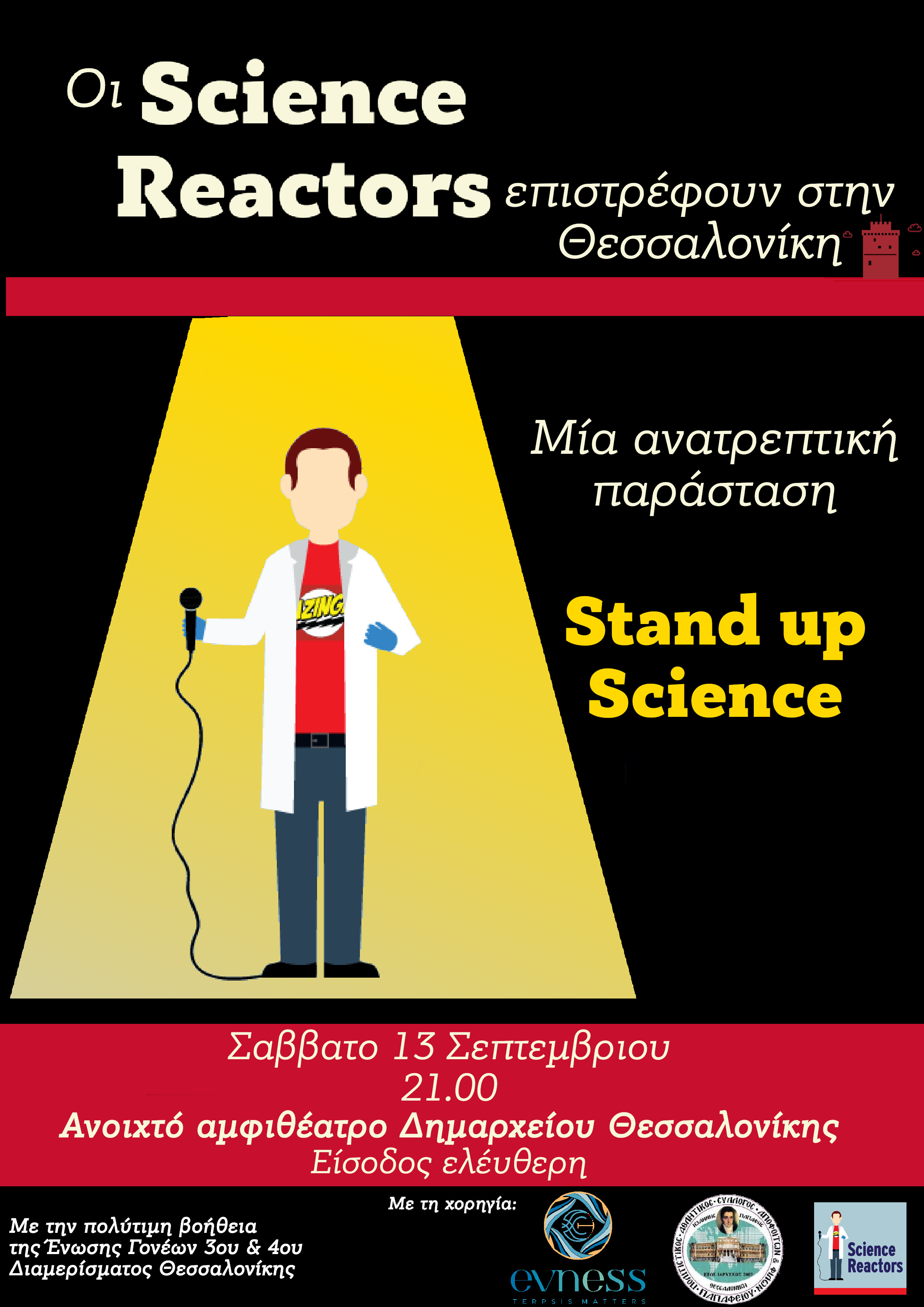Οι Science Reactors ήταν εκεί και έκλεισαν τα μαθήματα με ένα δροσερό, απολαυστικό και κεφάτο stand up αποκαλύπτοντας ένα άλλο πρόσωπο της επιστήμης. Το κοινό αντέδρασε με χαρά, γέλασε, συμμετείχε και τους χειροκρότησε.