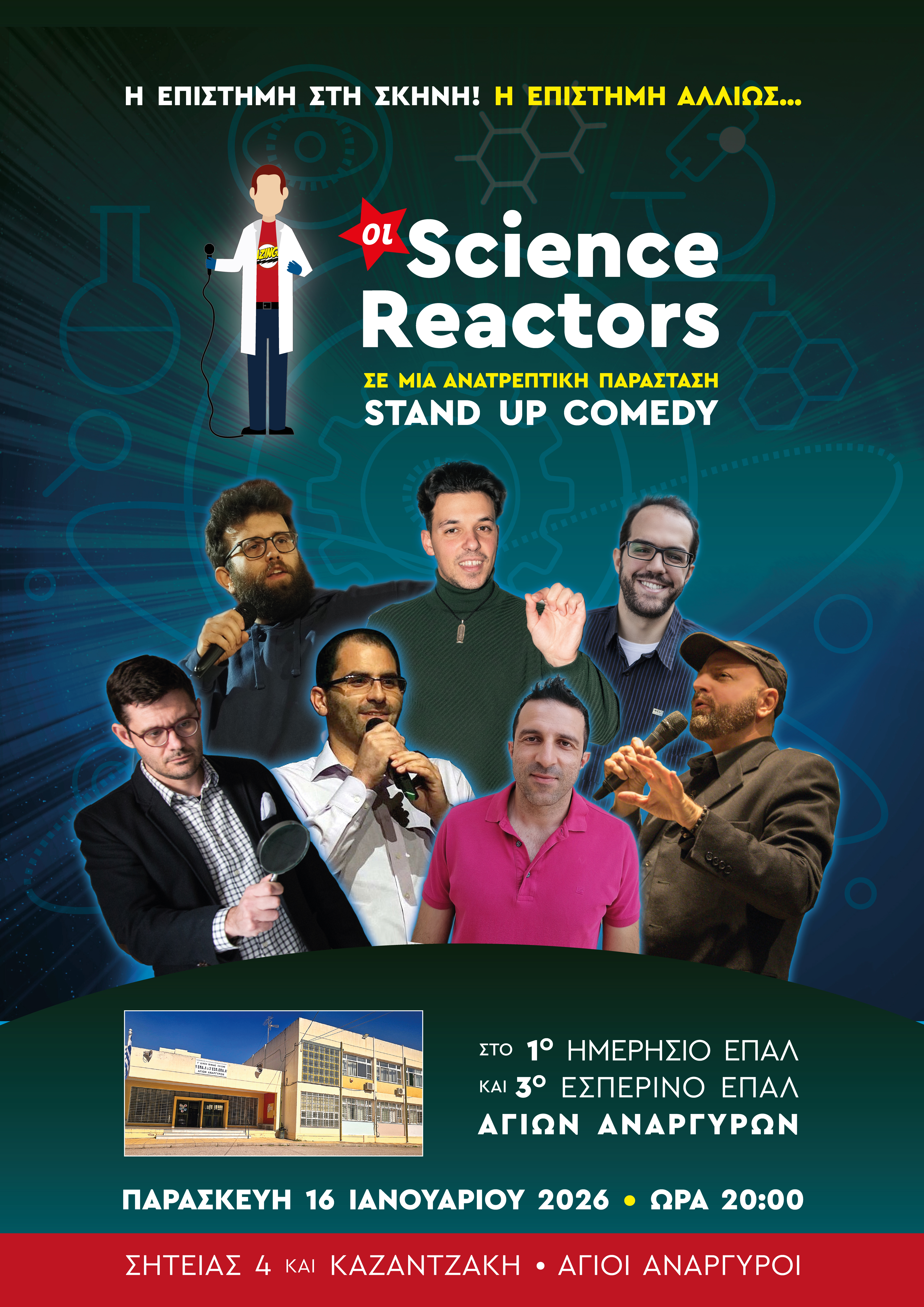 Οι ανατρεπτικές επιστημονικές αφηγήσεις των Science Reactors, αυτής της ομάδας των αντισυμβατικών επιστημόνων, θα γεμίσει ευφορία και γλαφυρότητα τον χώρο του αμφιθεάτρου. Στόχος τους; Να εξάψουν την επιστημονική περιέργεια του κοινού, να συμβάλλουν στην εξωστρέφεια της επιστήμης, να ανασκευάσουν τον μύθο ότι οι επιστήμονες δεν διαθέτουν χιούμορ και –ποιος ξέρει;– να μαζέψουν νέους fans.